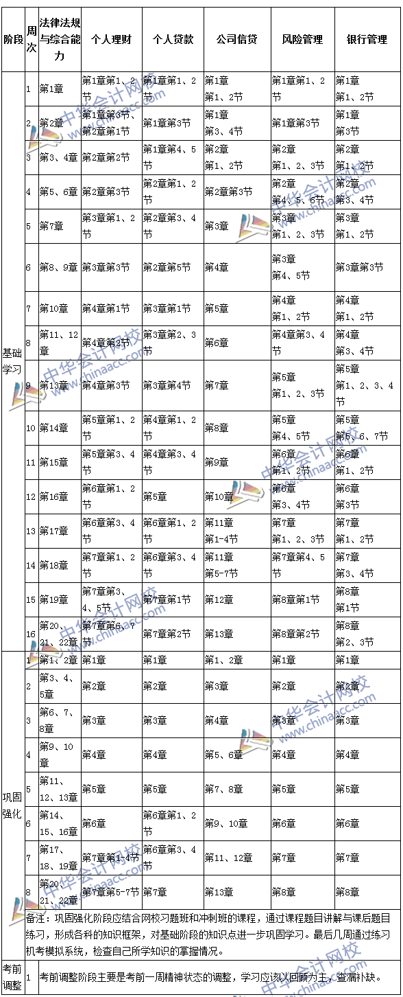 1、整体进度说明:本计划表时间上共计25周;其中:基础学习阶段安排16周,巩固强化阶段安排8周,考前调整阶段安排1周。学员可根据本表的提示,结合自己的工作,学习情况进行细化,并按网校要求完成听课、做题的学习任务,基本可满足考试需要。