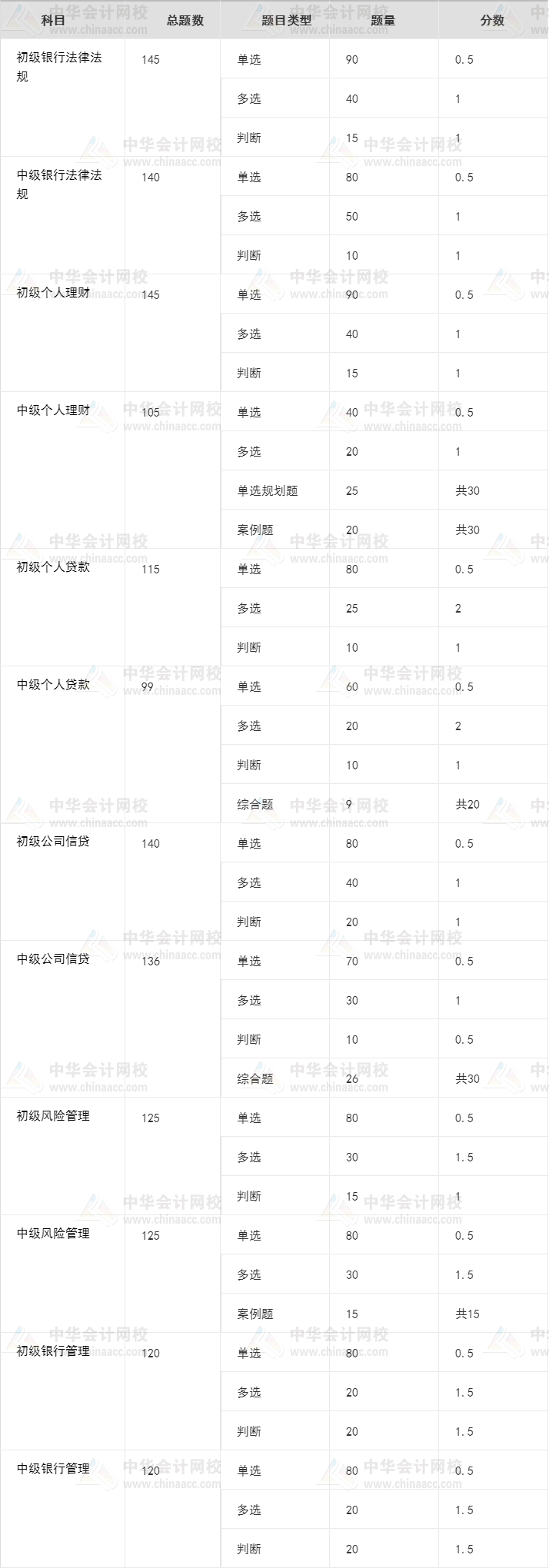 银行从业初级考试试题全部为客观题,包括单项选择题、多项选择题和判断题三种题型;中级考试试题题型为单项选择题、多项选择题、判断题和填空题等题型,下表仅供参考(具体题型以每年考试题型为准):