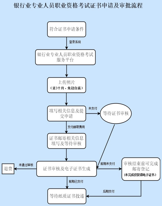 2014年起,银行业专业人员职业资格考试已启用纸质证书及纸质专业类别合格证明,证书发放采取邮寄方式。证书申请过程中,考生需在系统同时填写证书邮寄等相关信息,待证书审核工作结束后,等候证书发放(邮寄费由考生自行承担)。