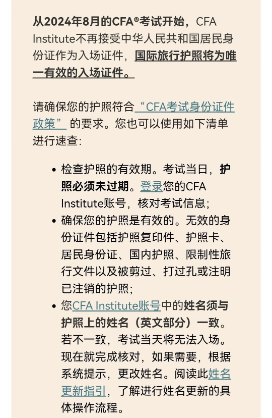协会发布重要邮件提醒,从24年8月考期起,协会不再接受中华人民共和国居民身份证作为入场证件!国际旅行护照将为唯一有效的入场证件!