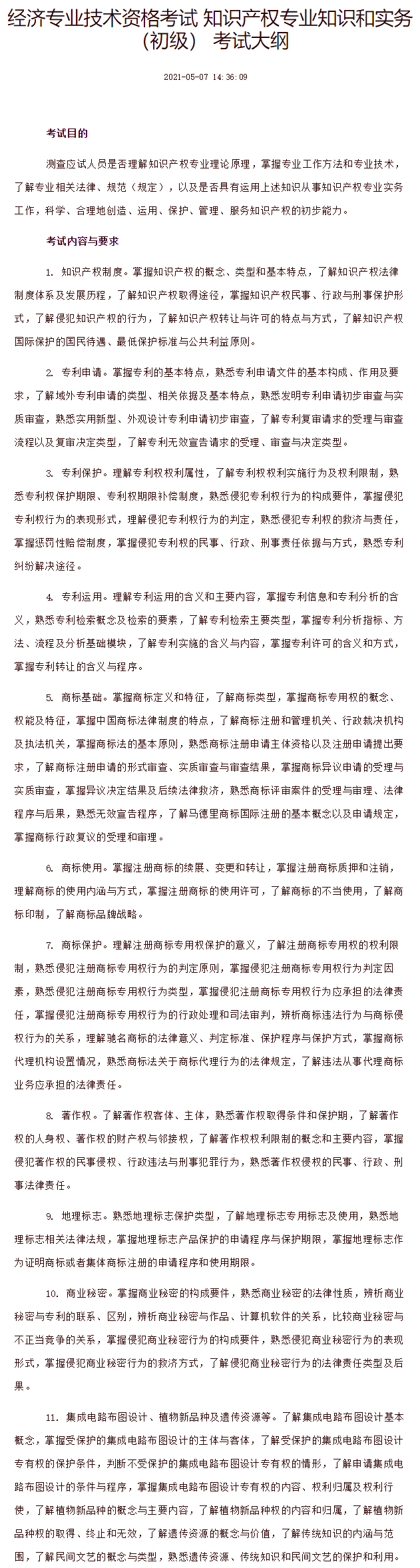 2021年初级经济师《知识产权》的考试大纲已经公布,考试大纲内容有哪些?正保会计网校小编特意为各位考生整理了相关信息,供广大考生参考。以下是2021年初级经济师《知识产权》的考试大纲内容,赶紧来看看吧~