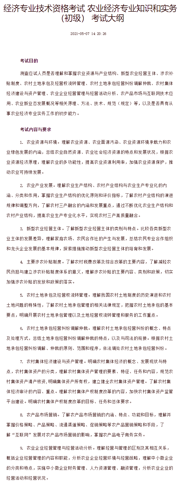 2021年初级经济师《农业经济》的考试大纲已经公布,考试大纲内容有哪些?正保会计网校小编特意为各位考生整理了相关信息,供广大考生参考。以下是2021年初级经济师《农业经济》的考试大纲内容,赶紧来看看吧~