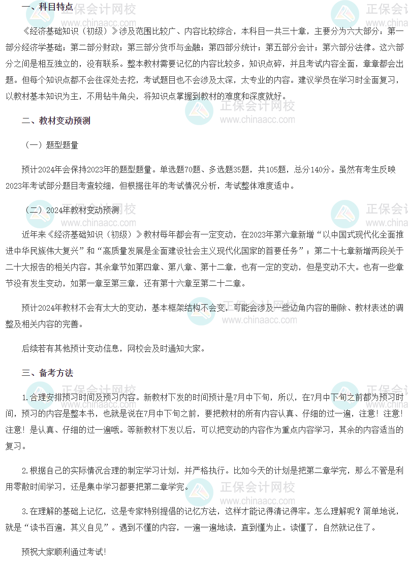 2024初级经济师备考已开启!为了防止大家在备考路上多走弯路,正保会计网校为广大考生朋友们整理了2024年初级经济师《经济基础知识》的科目特点、教材预测及备考方法,快来了解一下吧!