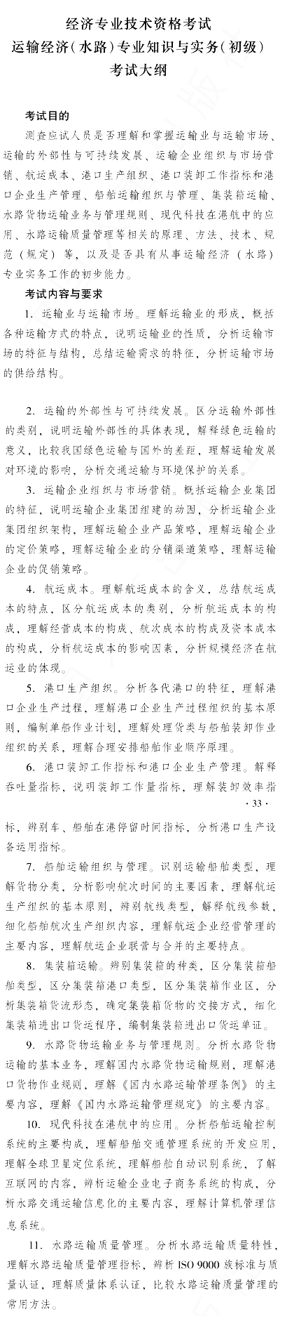 2019年经济师考试大纲现已正式公布!正保会计网校特意为考生整理了考试大纲,供经济师考试备考学员学习,以下是2019年初级经济师《运输(水路)专业知识与实务》考试大纲,供广大学员参考学习。