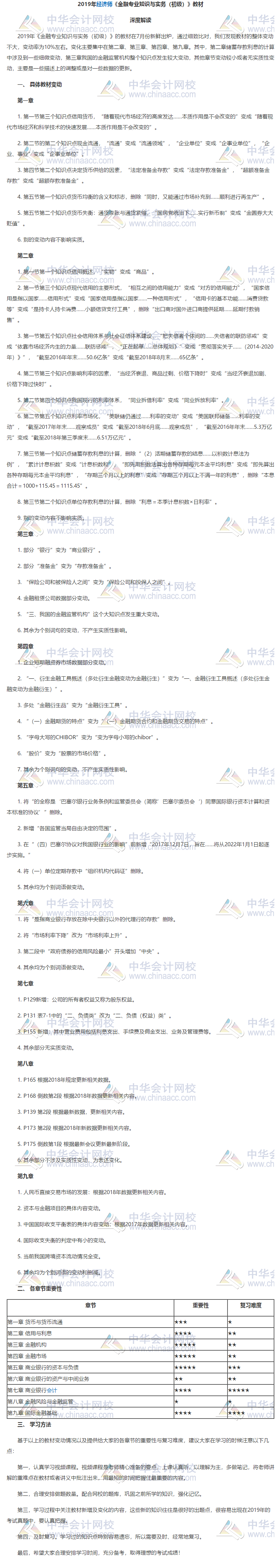 对于2019初级经济师教材变动情况,相信大家已经有所了解,《初级金融专业知识与实务》教材变动率为10%,点击查看:2019初级经济师《金融》教材变化对比>>下面,正保会计网校为大家带来2019初级经济师金融专业教材变动深度解析,供大家参考!