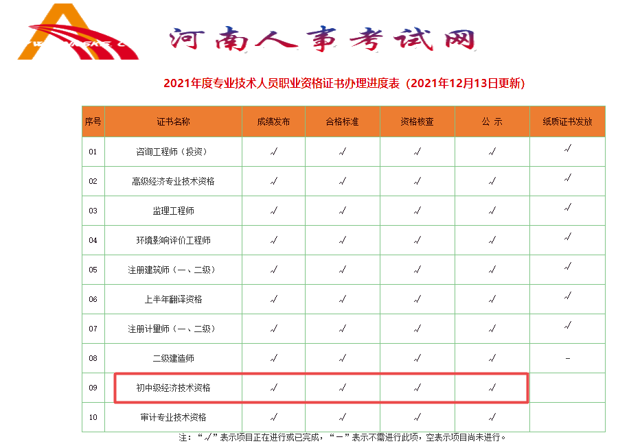 河南人事考试网发布“2021年度专业技术人员职业资格证书办理进度表”,2021年河南初中级经济师已到公示阶段了,截图如下: