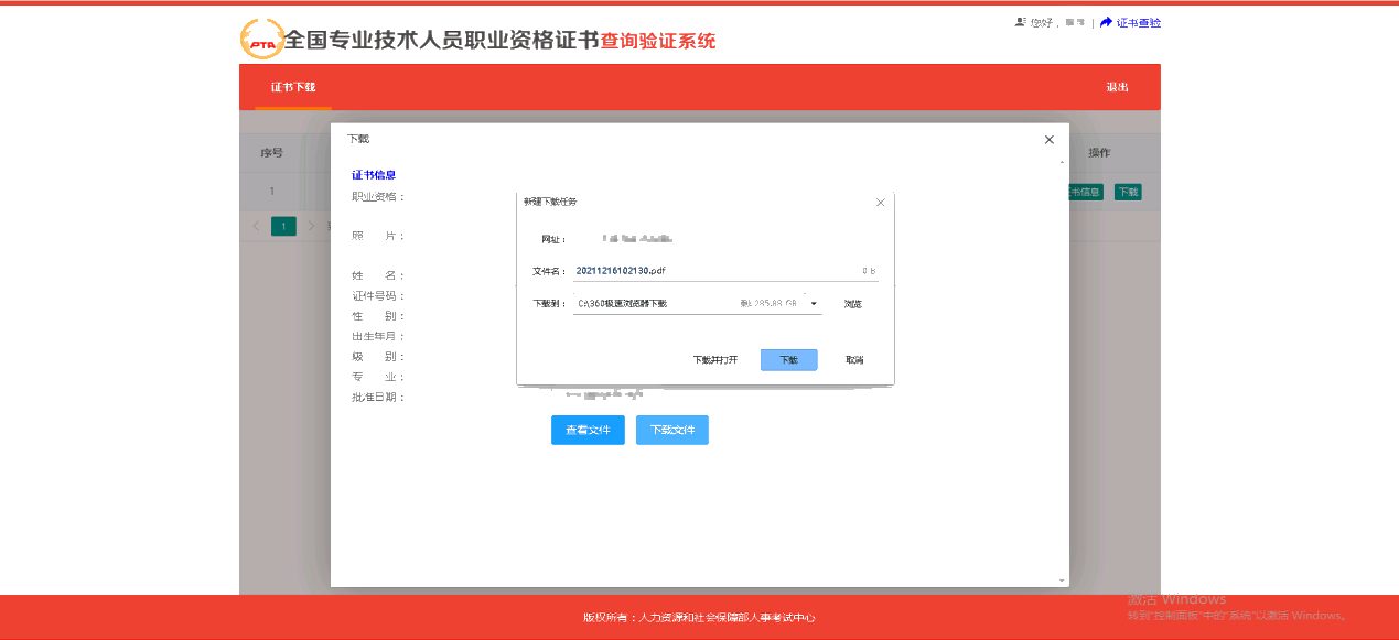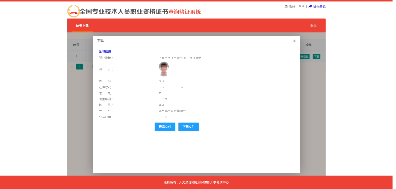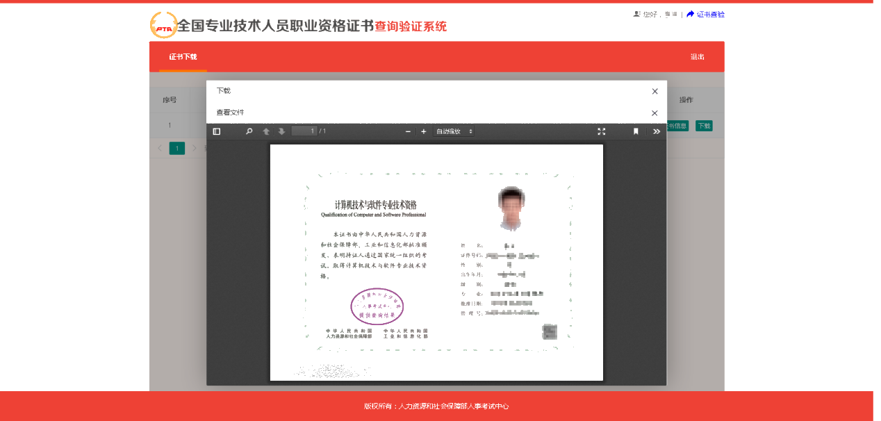 [证书下载]持证人员通过中国人事考试网“专业技术人员职业资格证书查询验证系统”查看和下载本人持有的电子证书(或证书电子文件)。