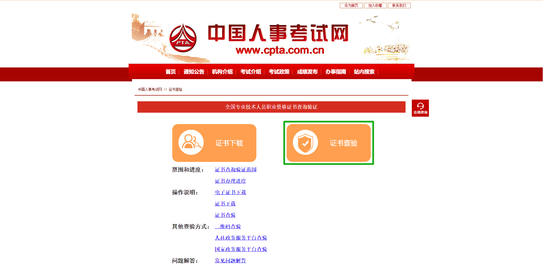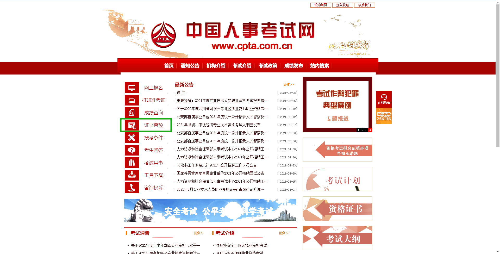 访问中国人事考试网()首页,点击左侧菜单中的[证书查验]。