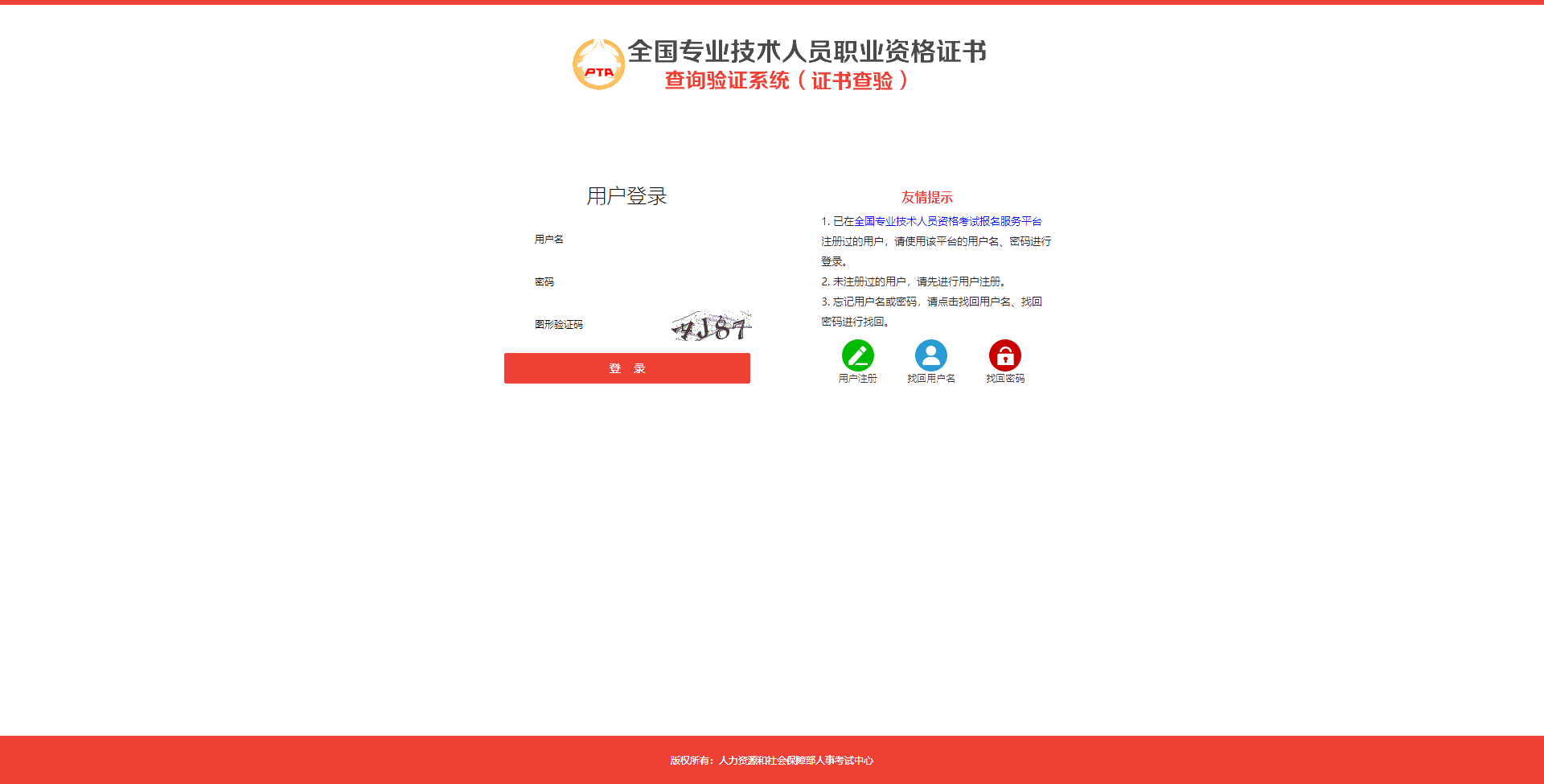 已在中国人事考试网“全国专业技术人员资格证书查询验证系统”或“全国专业技术人员资格考试报名服务平台”注册过的查询人员,请直接登录。