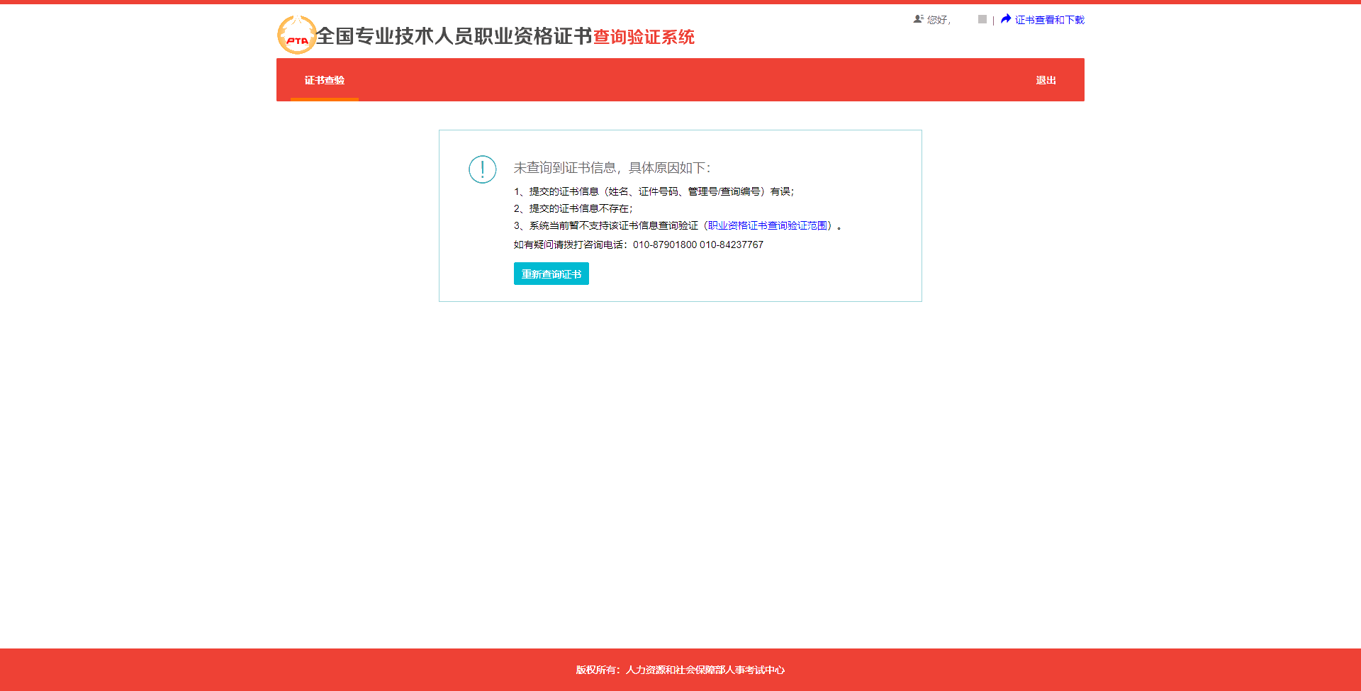 ①提交的证书信息(姓名、证件号码、管理号/查询编号)有误。