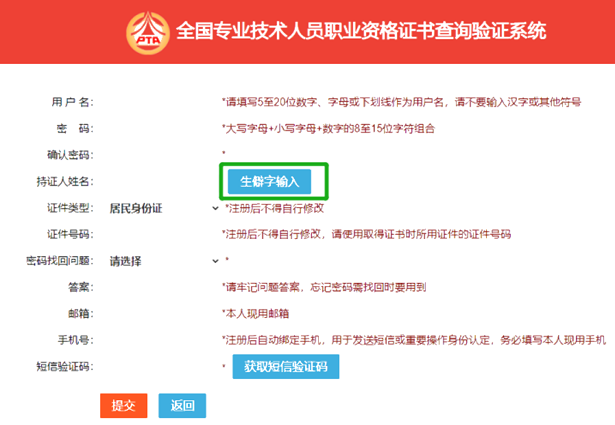 注册时,查询人员姓名中包含生僻字,在输入[查询人姓名]时,请点击右侧[生僻字输入]按钮。