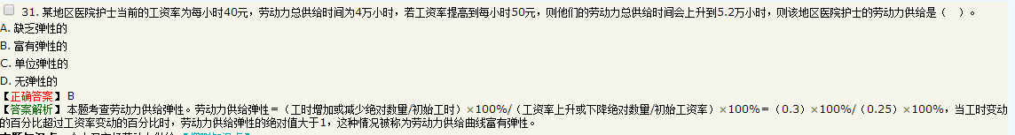 【解析】本题考查劳动力供给弹性。劳动力供给弹性=(工时增加或减少绝对数量÷初始工时)÷(工资率上升或下降绝对数量/初始工资率)=0.8,当工时变动百分比小于工资率变动百分比时,劳动力供给弹性小于1,这种情形被称为劳动力供给曲线缺乏弹性。参见教材P189。