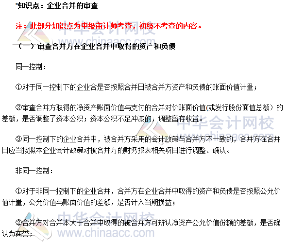 我们一起来学习2016年初级审计师《审计理论与实务》高频考点:企业合并的审查。本考点属于《审计理论与实务》第二部分企业财务审计中第七章财务报告审计的内容。