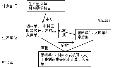 生产单位根据生产通知单,填写领料单,由部门经理批准后,交仓库部门领料。在手工系统中,领料单通常一式三联,仓库发料后登记材料明细账留用一联,领料单位保存一联,财会部门进行材料收发核算、成本计算使用一联。