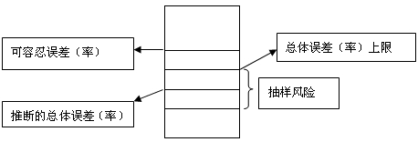 大的方框表示总体,抽样之前,审计人员可以确定一个可容忍误差(率),是审计人员主观意愿上所能接受的总体的最大偏差。然后进行抽样,根据抽样发现的误差(率)推断总体的误差(率)。