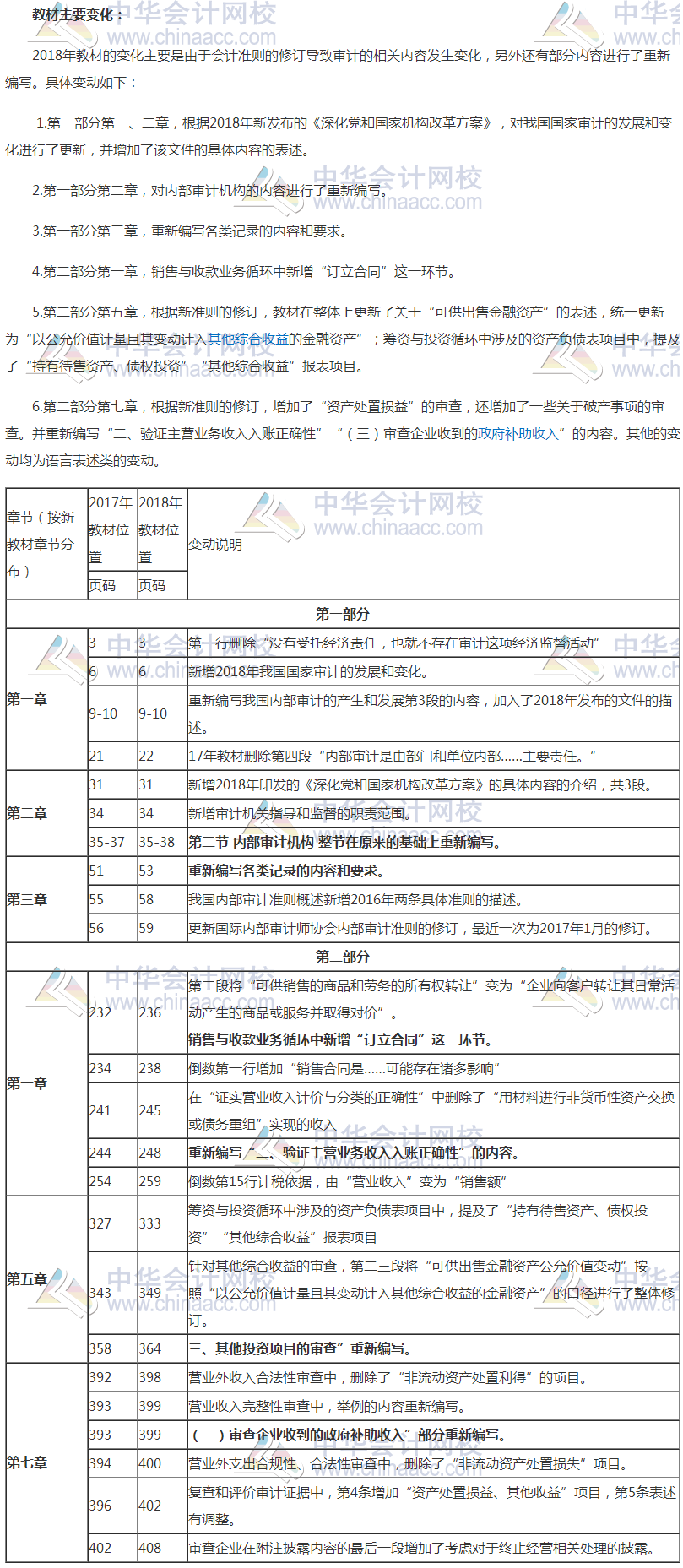 2018年审计师考试《审计理论与实务》教材已上市,新教材有一定的变化,正保会计网校特整理了2018年审计师考试《审计理论与实务》新旧教材变化对比,供大家参考。为了提高备考效果,建议广大考生学习时要结合网校老师的课程进行学习,同时结合网校的题库做题。祝大家学习愉快!
