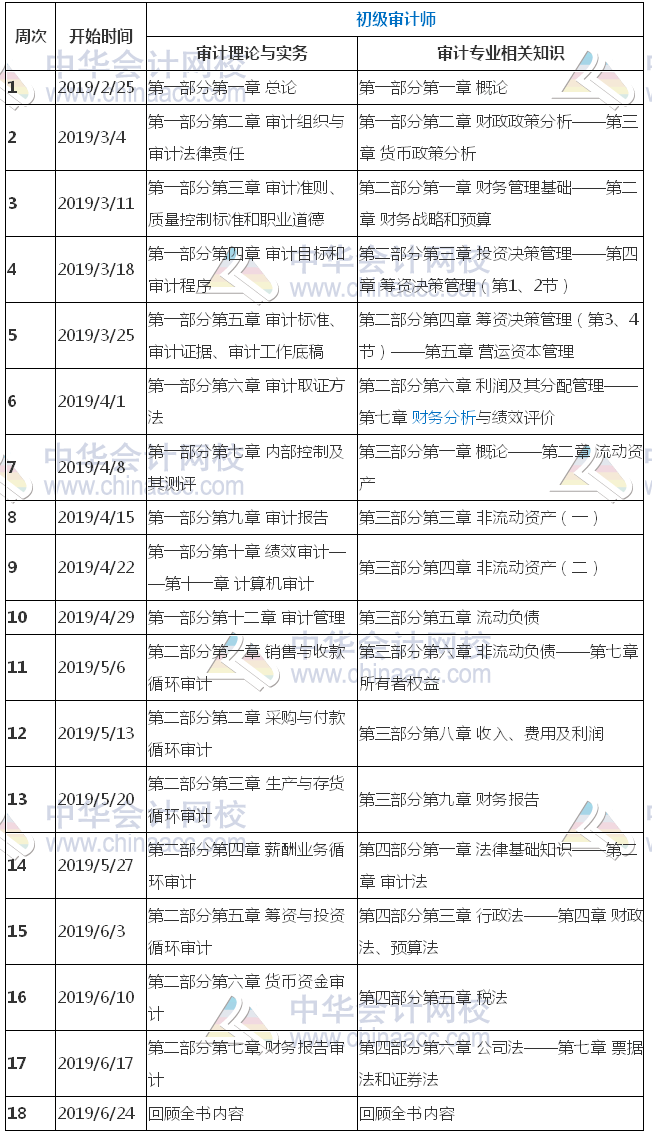2. 已报网校2019年审计师辅导高效取证班、精品实验班的同学,将由网校老师根据您的学习基础及学习时间制定更详尽的计划表,如与本表不一致,请以网校老师制定的学习计划为准。