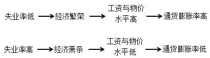 (1)菲利普斯曲线:短期内通货膨胀和充分就业存在此涨彼伏的消长关系——如果工资上涨率(物价水平上涨率,即通货膨胀率)较低,则失业率较高。