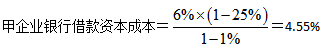【示例】甲企业向银行借款1000万元,手续费率为1%,期限3年,借款利率为6%,假设所得税率为25%。则:
