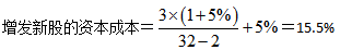 【示例】甲企业上一期股利D0=3元,预计长期的股利增长率g=5%;假定增发新股的发行价为32元,每股发行费用为2元,则: