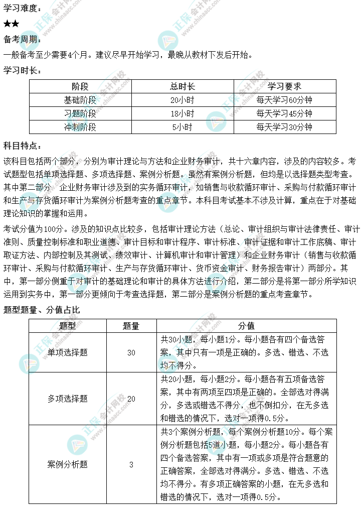 在备考审计师前,了解各科科目特点很重要,了解考试难度等内容,再观察自己的学习条件,综合考虑这些因素后再制订学习计划,才能更高效的学习。