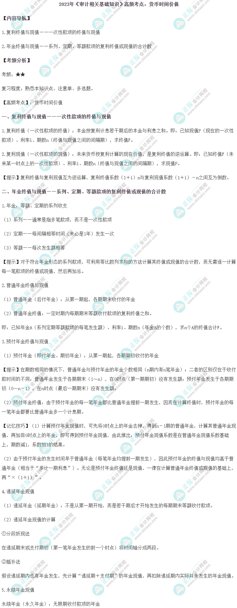2023年初级《审计相关基础知识》各章节哪些知识点经常考呢?老师给大家总结了!下面先看看2023年初级《审计相关基础知识》第二部分第一章高频考点:货币时间价值,好好复习哦!