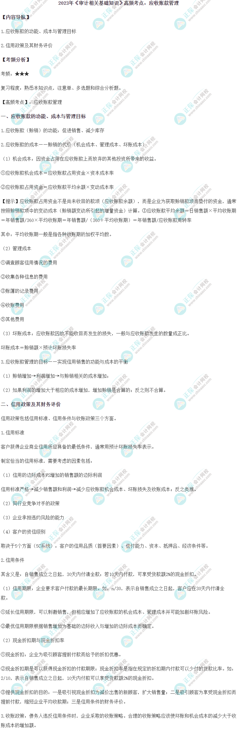 厚重的审计师教材,让很多考生发愁,该怎么才能记住呢?网校老师帮大家全面解读教材,希望同学们认真听课,老师总结的重点知识点一定要多复习,熟练掌握。下面更新2023年初级《审计相关基础知识》高频考点:应收账款管理,快复习一下吧。