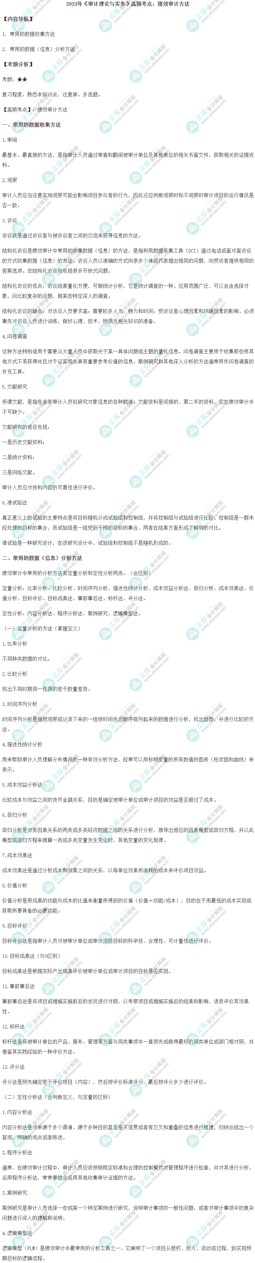 2023年审计师考试9月24日开考,现在正是紧张的备考阶段,各位考生应了解考试考点,提高复习效率!正保会计网校为各位备战初级审计师考试的考生带来了《审计理论与实务》高频考点,跟上老师的步伐按计划完成学习,马上开始学习今天的《审计理论与实务》高频考点:绩效审计方法。