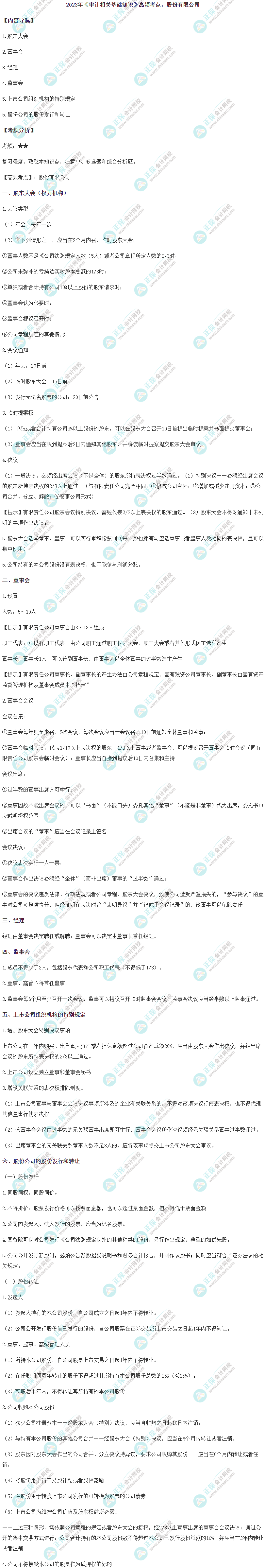 厚重的审计师教材,让很多考生发愁,该怎么才能记住呢?网校老师帮大家全面解读教材,希望同学们认真听课,老师总结的重点知识点一定要多复习,熟练掌握。下面更新2023年初级《审计相关基础知识》高频考点:股份有限公司,快复习一下吧。