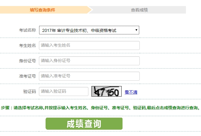 审计师考试成绩查询步骤:选择考试名称,并按提示输入考生姓名、身份证号、准考证号、验证码,最后点击成绩查询进行查询。