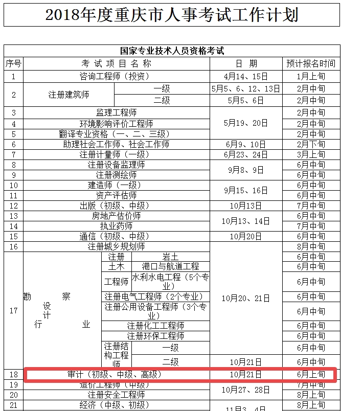 重庆市人事考试中心公布了《2018年度重庆市人事考试工作计划》,其中明确2018年审计师考试时间为10月21日,报名时间预计为6月上旬。希望广大考生认真备考,报名时间公布后,网校会及时为大家更新!