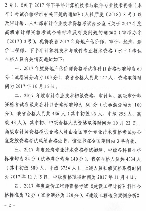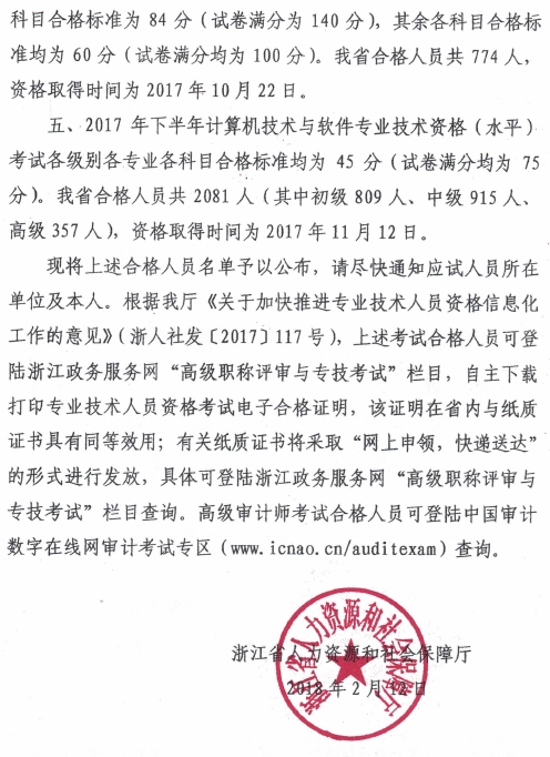 浙江省人力资源和社会保障厅关于公布2017年房地产估价师、审计、经济、造价工程师、下半年计算机技术与软件资格(水平)考试合格人员名单的通知