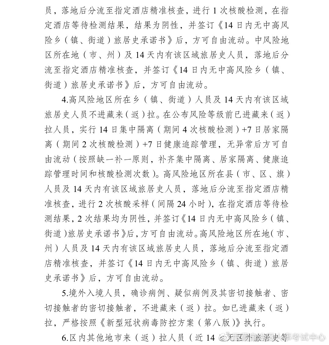 (四)因疫情存在动态变化,疫情防控工作要求也将作出相应调整。如考试前出现新的疫情变化,我厅将根据自治区及拉萨市疫情防控有关要求,及时发布调整补充通知,进一步明确防控要求,请广大考生密切关注西藏自治区人力资源和社会保障厅官网()和西藏自治区人事考试中心新浪官方微博()。
