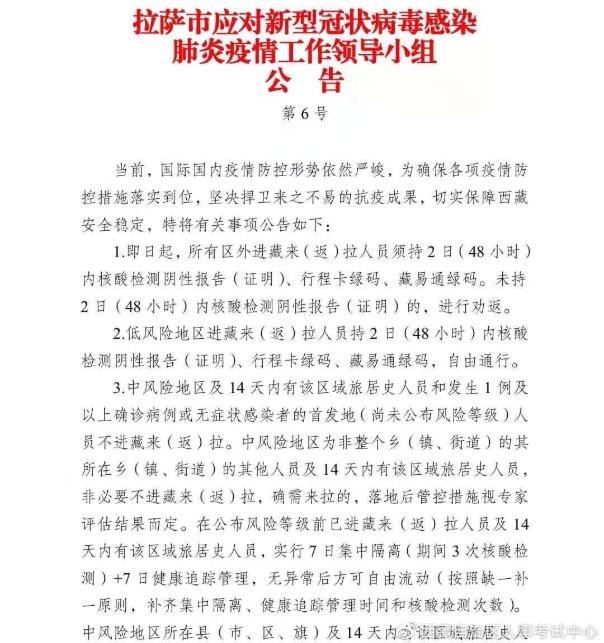 (三)严格落实拉萨市应对新型冠状病毒感染肺炎疫情工作领导小组公告第6号要求(附件2),凡考前14天内所有区外进藏人员必须持核酸检测阴性报告(纸质和电子版均可)。
