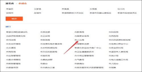 ②请选择区划“孝感市”,显示为“湖北省>孝感市” (注:不要点击“县(市、区)”区划链接,也不要点击“确定”按钮),再在部门列表中,选择并点击“市人社局”链接,如图所示: