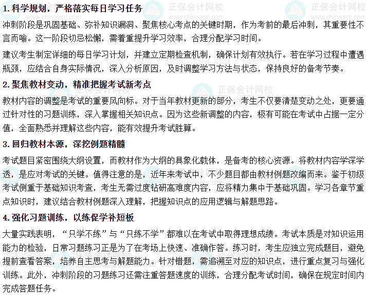 在初级会计职称考试的冲刺阶段,高效的备考方法和科学的学习规划是决胜关键。以下从四个核心方向为考生梳理冲刺要点: