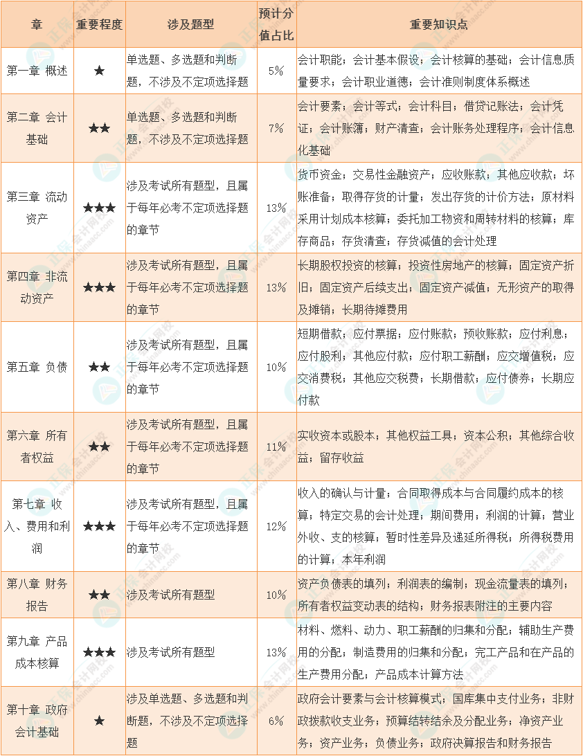 2024年初级会计考试于5月18日-22日进行,距考试越来越近,对于各位初级考生来说的备考黄金期也已到来,这个阶段除了常态备考外,也需要了解各章节的重要程度、考试可能会涉及到的题型以及每章的预计分值占比,正保会计网校教研团队对此进行了整理总结,一起来跟着学习吧。