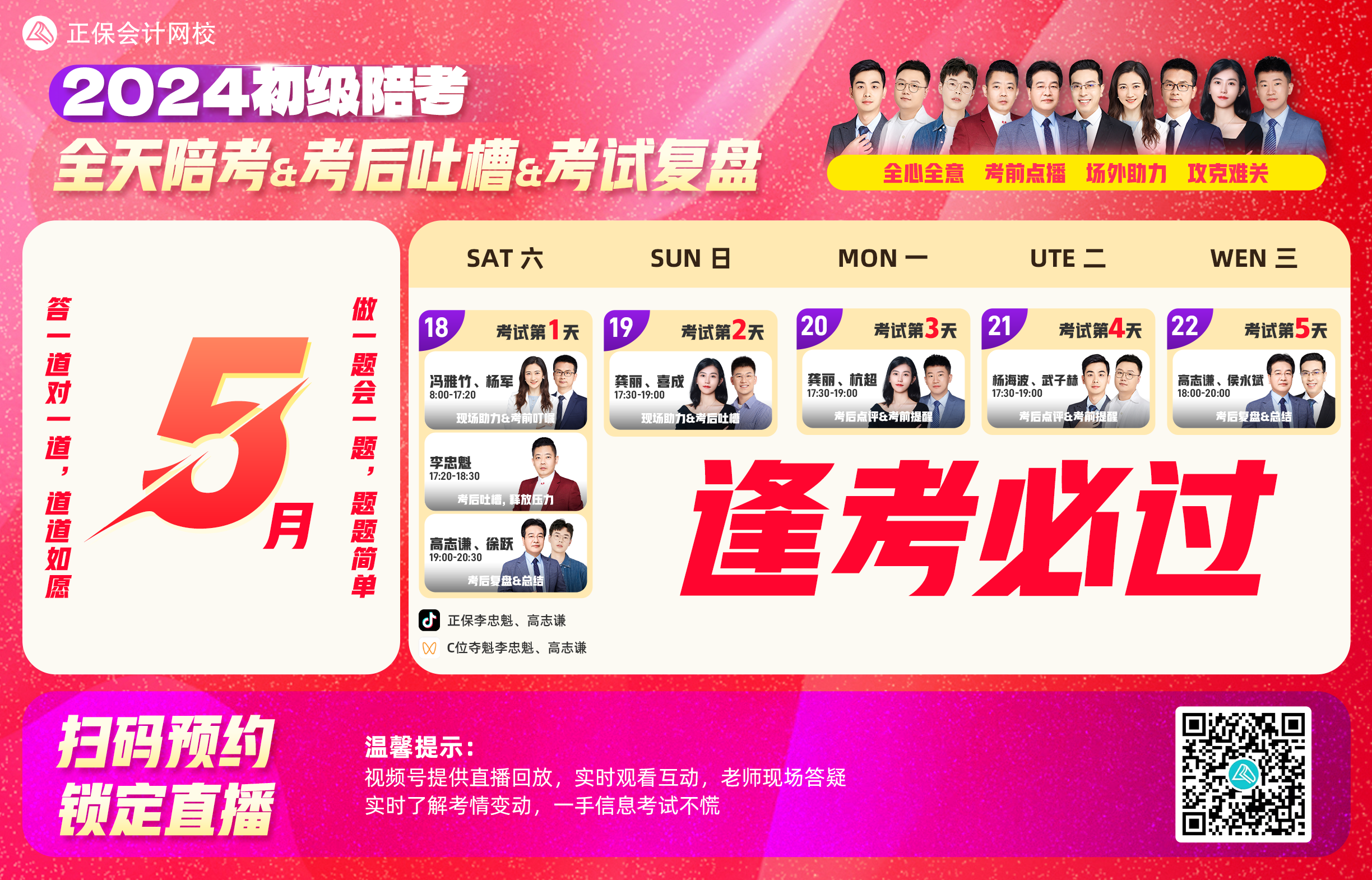| 5月18日19:00-20:30 | 2024初级会计陪考驿站-DAY1 | 高志谦/徐跃 | 观看入口 |