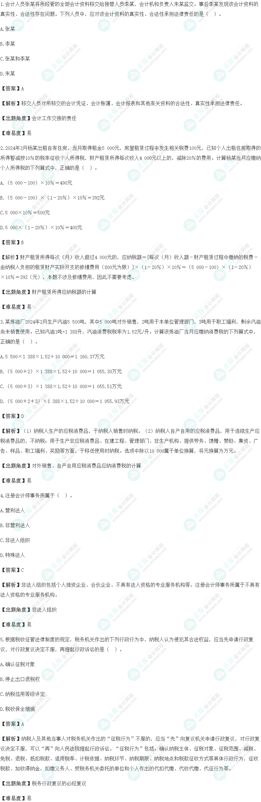 2024年初级会计考试终于结束啦,同学们考的如何呢?正保会计网校特整理的2024年初级会计考试试题及参考答案,本文为《经济法基础》单选题回忆版第一套试卷,供大家参考,预估初级会计考试成绩,一起来看看吧。
