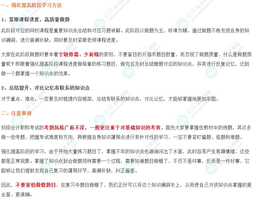 经过了初级会计职称基础阶段的学习,现在我们将进入到初级会计职称强化提高阶段的学习,掌握正确的学习方法能够达到事半功倍的效果,为此正保会计网校教研团队针对强化提高阶段为大家总结了几点学习方法和注意事项,供大家参考。