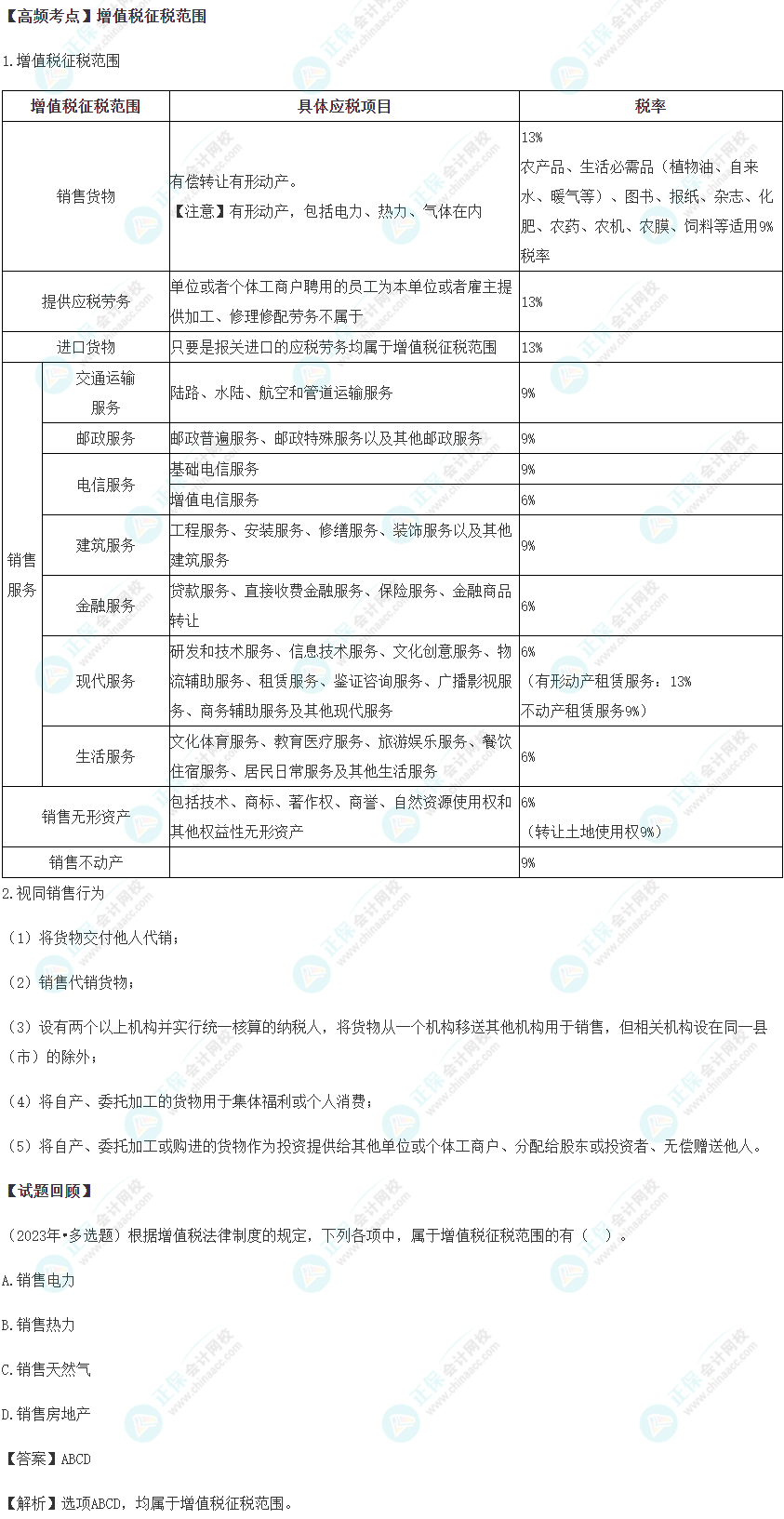 我们一起来学习2024《经济法基础》高频考点:增值税征税范围。本考点属于《经济法基础》第四章税法概述及货物和劳务税法律制度第二节增值税法律制度的内容。
