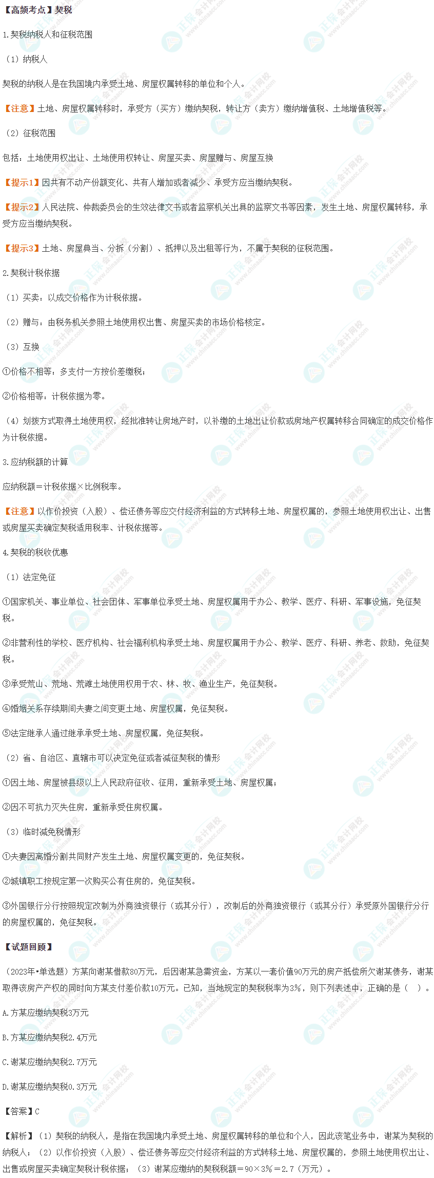 我们一起来学习2024《经济法基础》高频考点:契税。本考点属于《经济法基础》第六章财产和行为税法律制度第二节契税法律制度的内容。