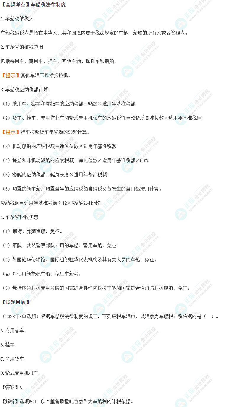 我们一起来学习2024《经济法基础》高频考点:车船税。本考点属于《经济法基础》第六章财产和行为税法律制度第六节车船税法律制度的内容。