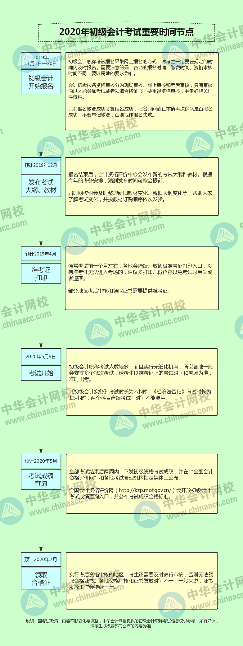 除了报名以外,初级会计考试还有打印准考证、发布考试大纲、查分等多个环节,那么这些事项都是如何安排的呢?正保会计网校根据财政部发布的2020年初级会计全国报名简章,并结合历年考试安排,总结出下图供考生参考,快收藏起来吧!