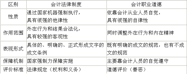 区别咱们看看表格应该就可以理解了,一个是来硬的(法律),一个是来软的(道德),还是柔中带刚的那种(有些会计职业道德是有相关规范的)。