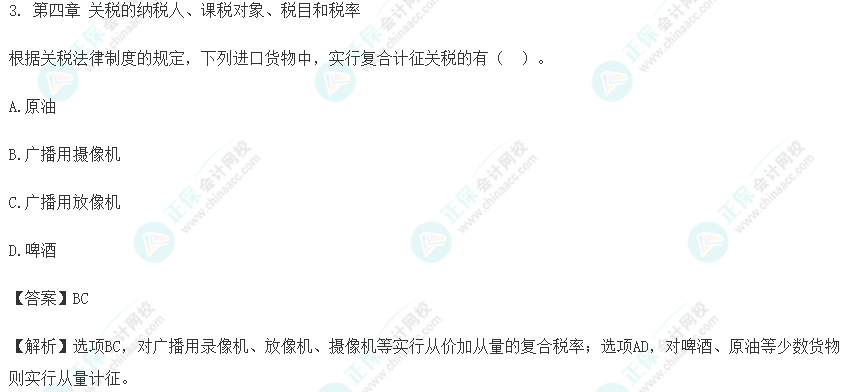 【点评】本题考核“关税的纳税人、课税对象、税目和税率”知识点。该题目所涉及知识点在下列正保会计网校(www.fawtography.com)2022年初级职称《经济法基础》辅导中均有体现:侯永斌老师【高效实验班】、【超值精品班】、【尊享无忧班】基础精讲第六章第09讲;杨军老师【高效实验班】、【超值精品班】基础精讲第六章第07讲;张稳老师【高效实验班】基础精讲第四章第22讲;李杰老师【高效实验班】基础精讲第六章第09讲;方源老师课程中直播开讲第四章 关税应纳税额计算、第五章企业所得税纳税人、免税收入、税前扣除标准(一)(2022.1.24);武子赫老师【C位夺魁班】逐章精讲第四章 车辆购置税、关税、第五章企业所得税征税对象、所得来源确定、应纳税所得额(2022.2.24);侯永斌老师2022年《经济法基础•应试指南》第354页;张稳老师2022年《经济法基础•经典题解》(打基础)第151页。