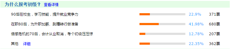 以上数据来源于正保会计网校调查问卷。可以看出,为升职加薪、跳槽转行做准备是大多数考生报考初级的主要动力。