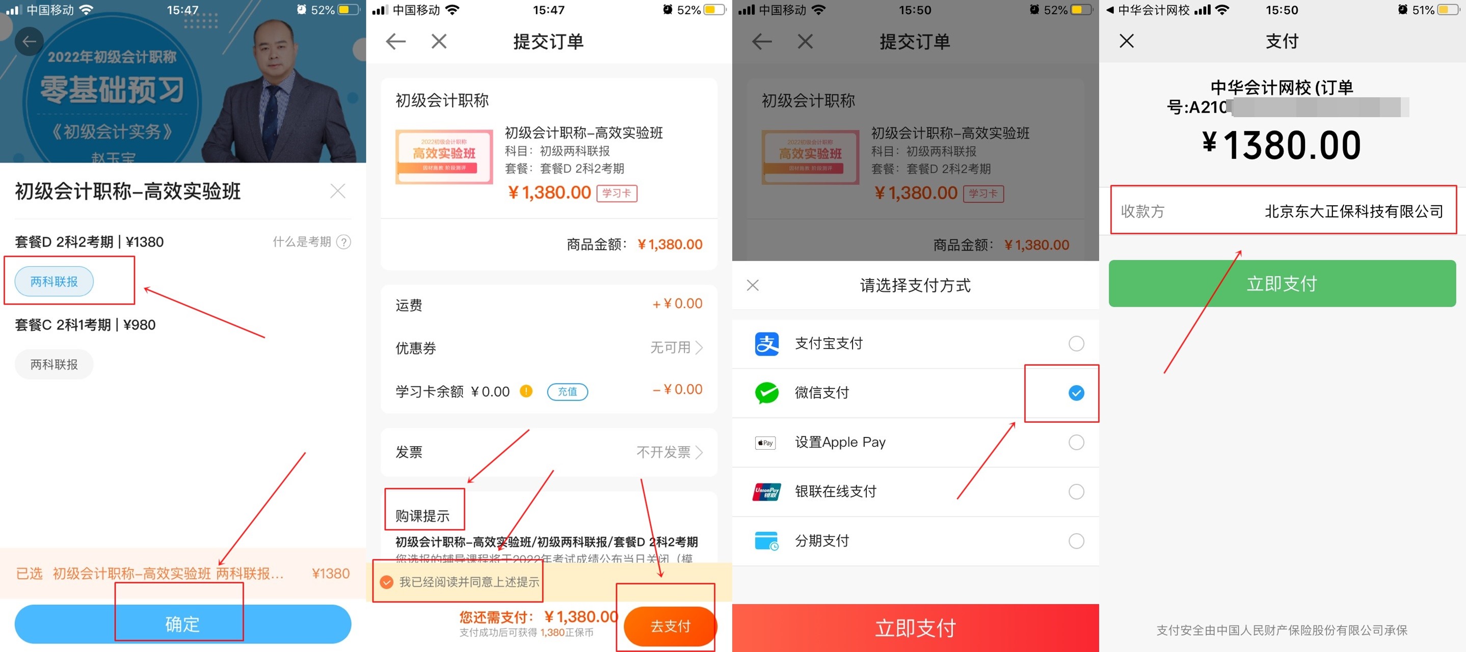 第二步:选择套餐—确认订单信息—阅读购课提示—去支付—支付成功后即可看课。