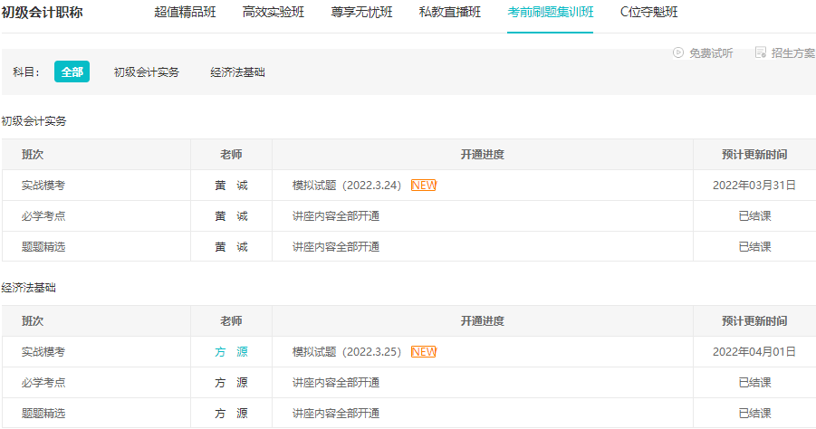 初级会计刷题集训班【实战模考】已更新!赶快学!黄诚和方源老师的课程又更新啦,已购课的初级会计考生抓紧跟上进度学习喽,模拟试题也已经更新,赶快去做题听课~