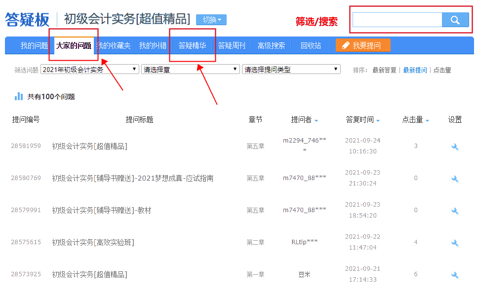 想查看问题有没有被回复,可以点击“我的问题”,然后按照提问的类型查看;在主动提问前,可以利用右上角“搜索框”功能,按照时间、章节、标题等不同条件来查看自己想要查看其他小伙伴的问题,或许会有你想要的答案;大家还可以在“答疑精华”中找到一些经典的、比较常见的共性问题。